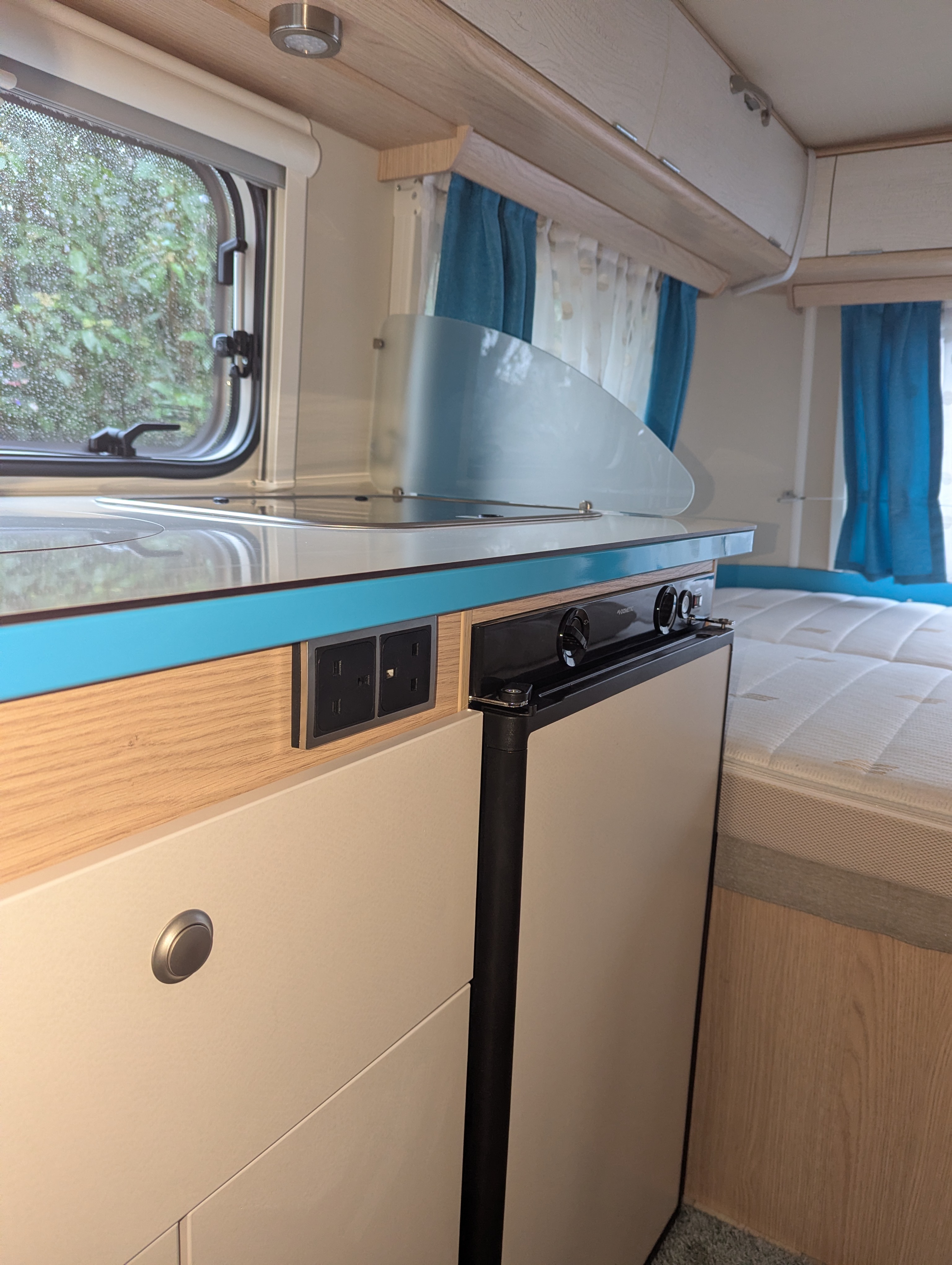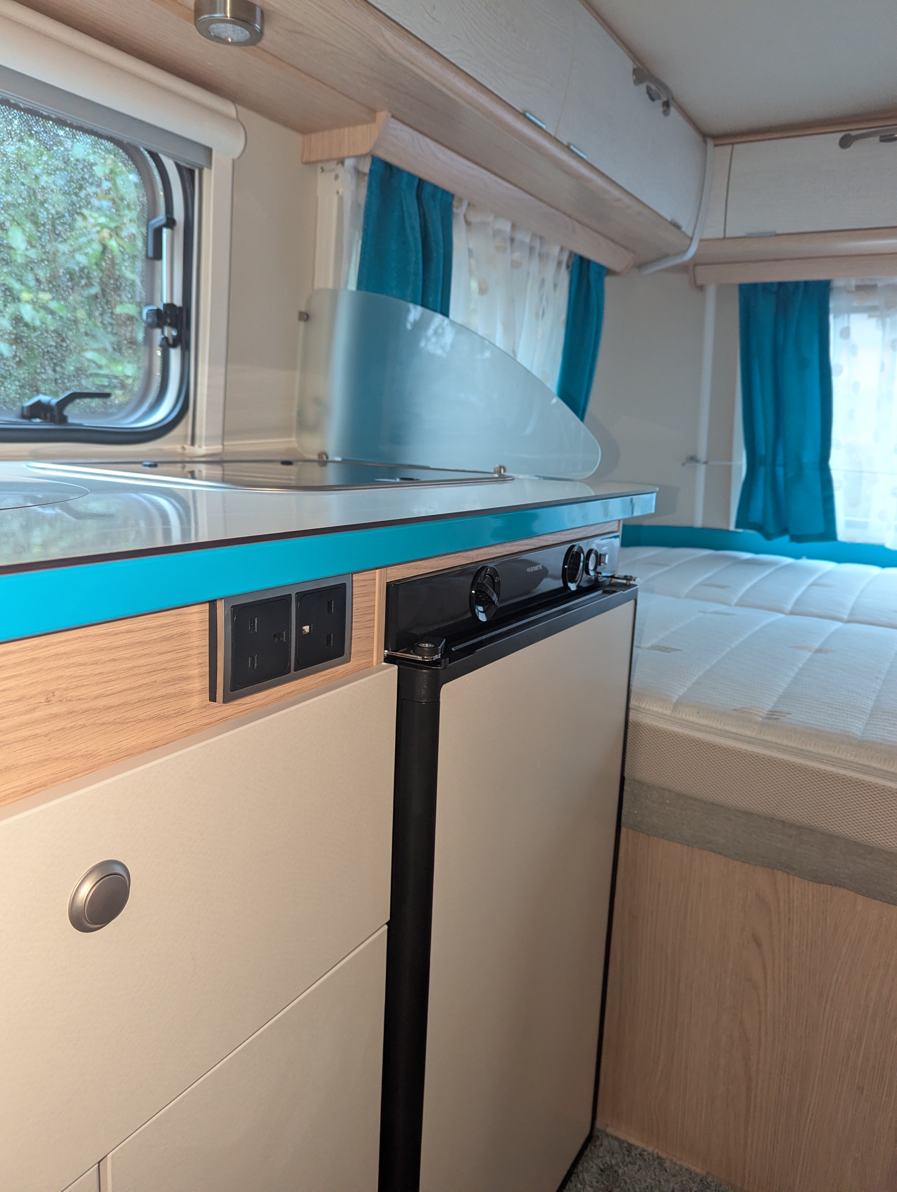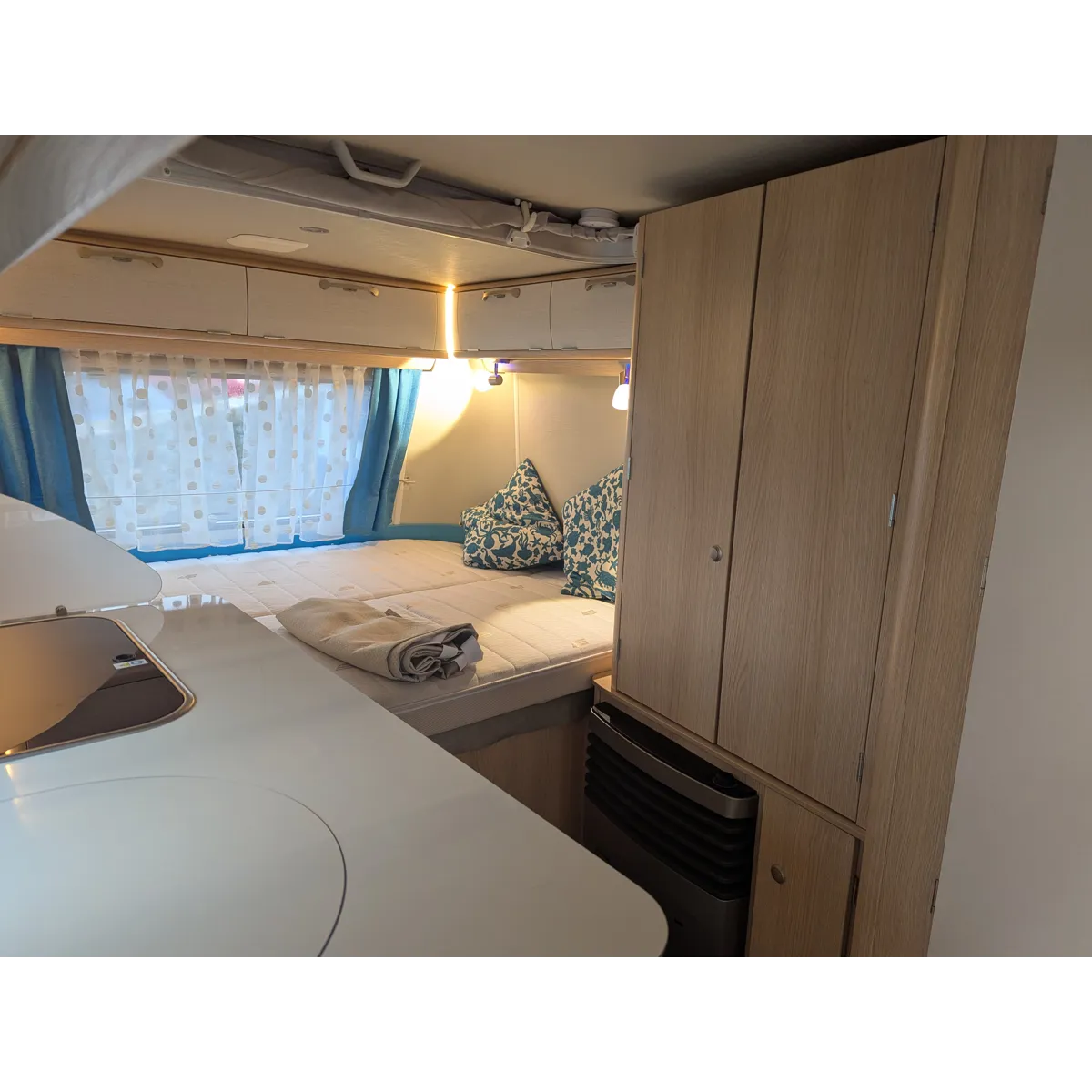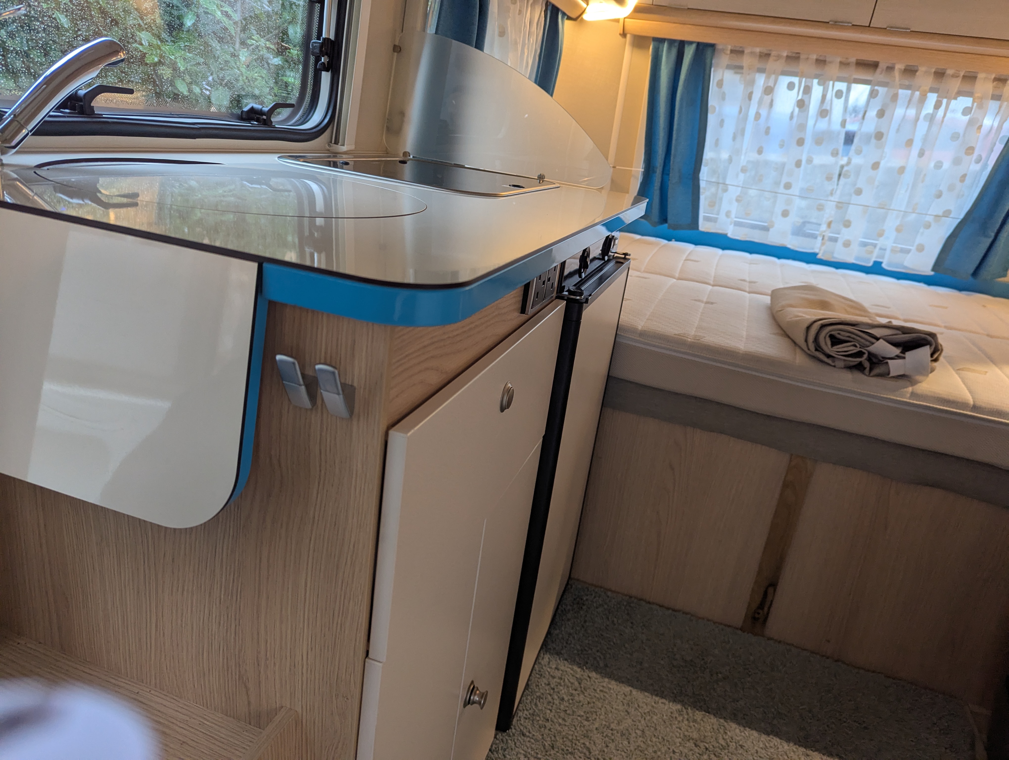 Roll-up mosquito screen door, 30L Fresh Water Tank, Exterior Locker Door, Additional reading lights, 2 Utensil Bags, Stone deflector, Loose Fit Carpets, Sink cover & cutting board, Cassette Toilet, Transverse Bed, Fridge